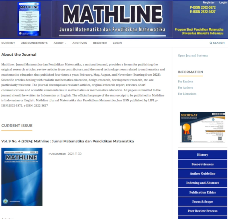 Mathline adalah jurnal online yang dikelola oleh program studi Pendidikan Matematika. Jurnal ini dibuat dengan aplikasi open-source OJS (Open Journal System), diakses melalui link https://mathline.unwir.ac.id, dan memiliki tampilan beranda seperti terlihat pada gambar di bawah ini.